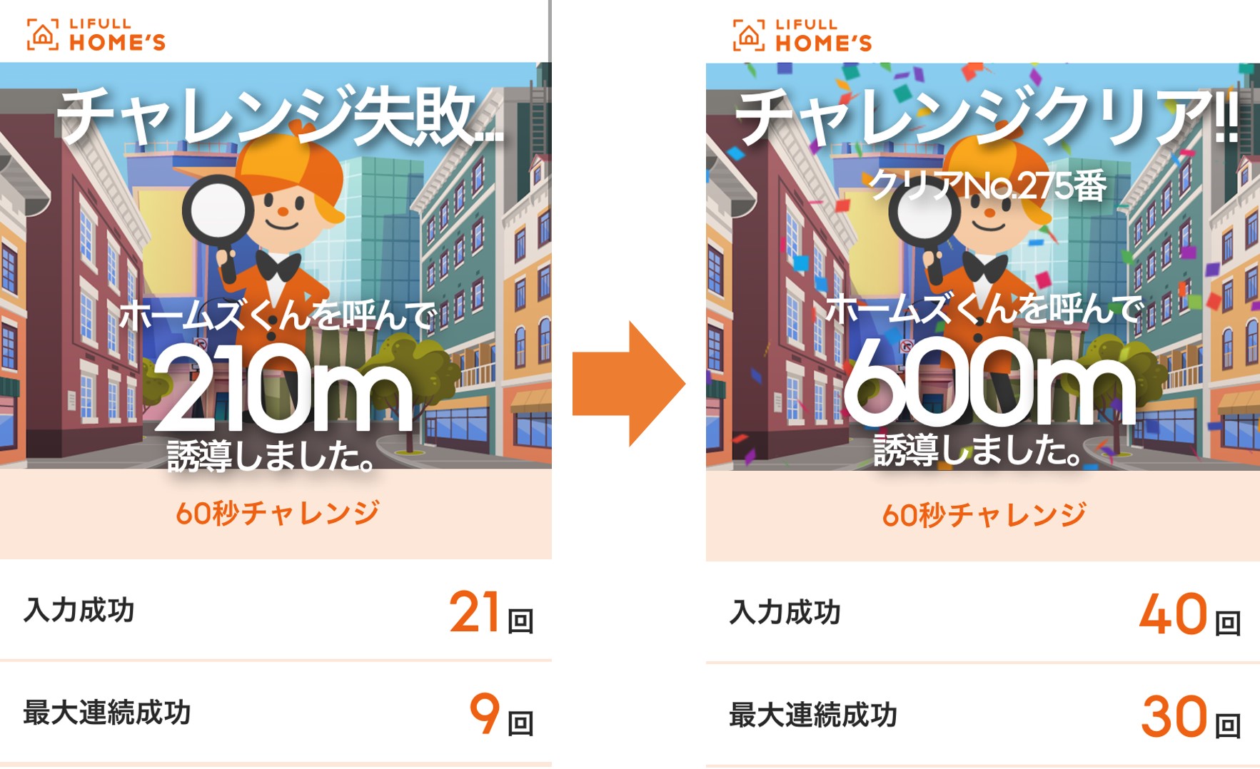 「ホームズ」1回の入力で10m進みます。10回連続入力成功で50mのボーナスが付与されます。