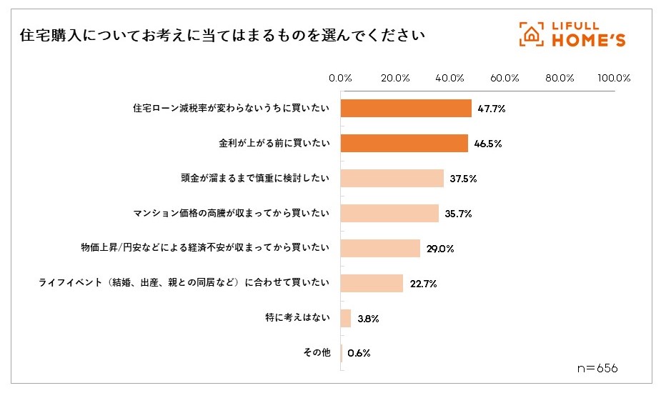 「住宅購入についての考え(複数回答可)」を聞いたところ、もっとも多かったのが「住宅ローン減税率が変わらないうちに買いたい」(47.7%)で、次いで「金利が上がる前に買いたい」(46.5%)となりました。この2つの回答は、ともに45%を超えており、物件価格以外で総支払額に大きな影響をあたえる「減税」と「金利」が購入の意向を左右する重要なポイントになっているようです。