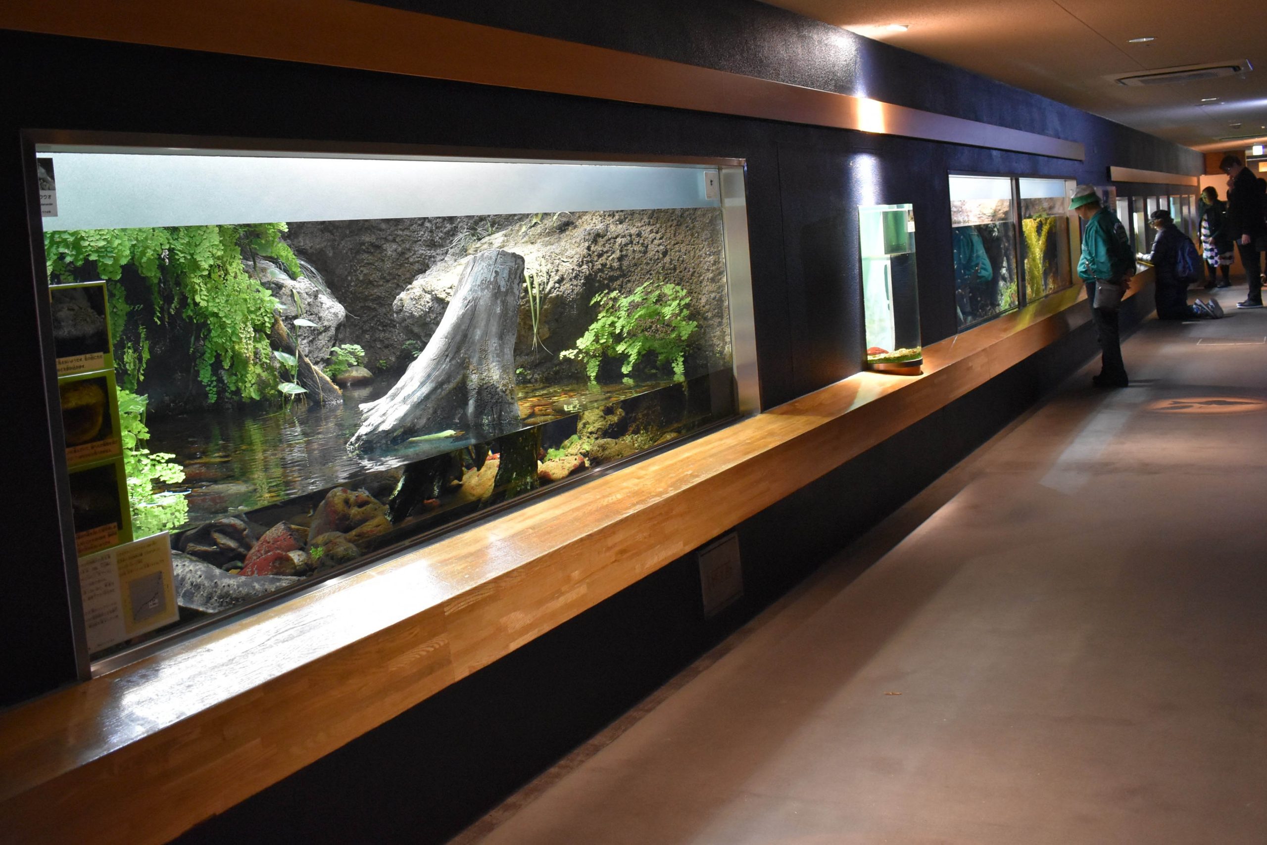 金魚が泳ぐ大水槽がエントランスでお出迎えしてくれる「足立区生物園」があります。海の生きもののほかにも、南国の蝶が舞う大温室、年間を通して飼育しているホタル、里山の自然を再現した昆虫ドーム、小動物とのふれあいコーナーといったゾーンがあり、昆虫、魚類、両生類、は虫類、鳥類、哺乳類など約500種の生きものが飼育されています。
