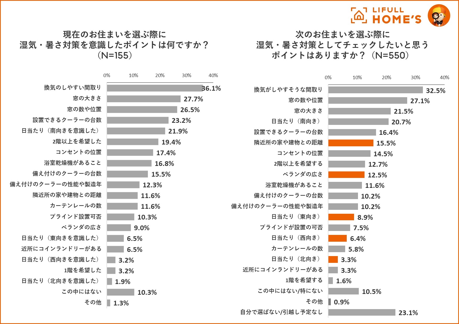 また、次の住まいを選ぶ際にチェックしたいポイントの上位3位は現在の住まい選びと同じ顔触れでした。また回答率が伸びた項目は「隣近所の家や建物との距離」が3.9Pt(11.6%→15.5%)、「ベランダの広さ」が3.5Pt(9.0%→12.5%)、「日当たり(東向き)」が2.4Pt(6.5%→8.9%)でした。現在のお住まいでの経験をもとに、湿気・暑さ対策として住まい探しの際に注目したいポイントのようです。