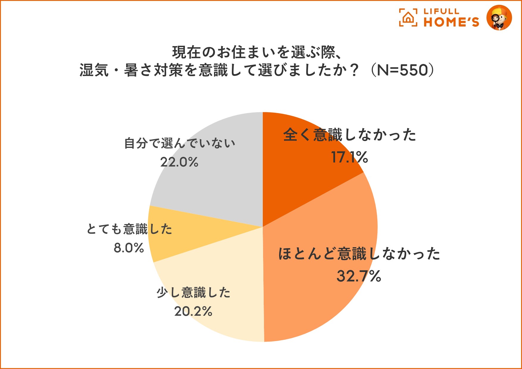 今の住まいを選ぶ際に「湿気・暑さ対策を意識せずに選んだ人」は約半数(49.8%:全く意識しなかった17.1%、ほとんど意識しなかった32.7%)でした。住んだ後に「湿気・暑さ対策」を考えるものの、住まい選びの段階では、湿気・暑さを意識しておらず優先順位が低いことが分かりました。