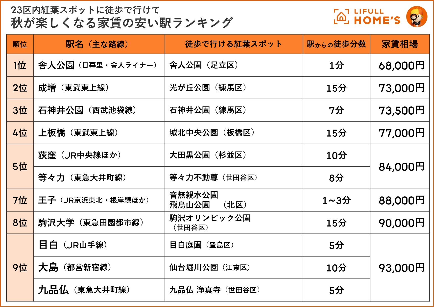 23区内の紅葉スポットに徒歩で行けて秋が楽しくなる家賃の安い駅ランキング
