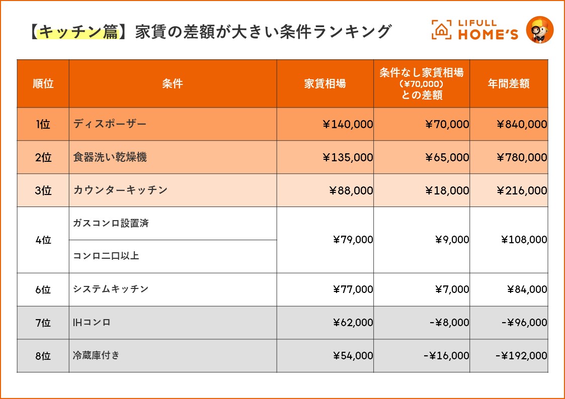 1・2位から大きく離れ、3位以降は「カウンターキッチン」(差額:18,000円/月)、「ガスコンロ設置済」「コンロ二口以上」(差額:9,000円/月)、「システムキッチン」(差額:7,000円/月)となりました。また、「IHコンロ」「冷蔵庫付き」については条件なしの家賃相場より安くなる結果となりました。