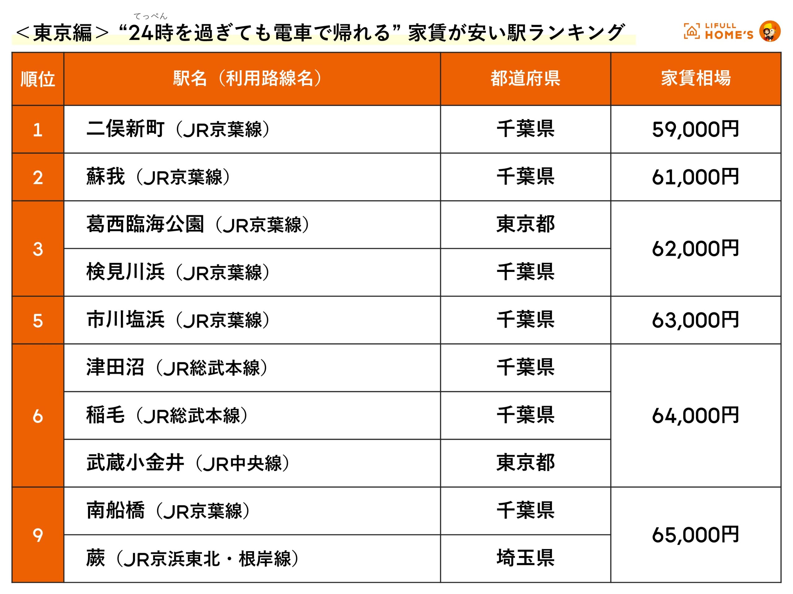 <新宿・東京・渋谷・池袋編> LIFULL HOME'S「“24時(てっぺん)を過ぎても電車で帰れる” 家賃が安い駅ランキング」を発表