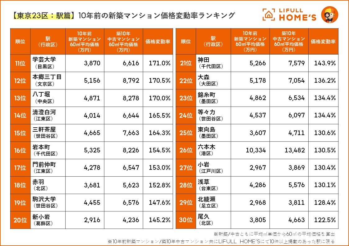 家を買うなら、資産形成も視野に街を選びたい 『10年前の新築マンション価格変動率ランキング(東京23区:行政区/駅篇)』 をLIFULL HOME'Sが発表