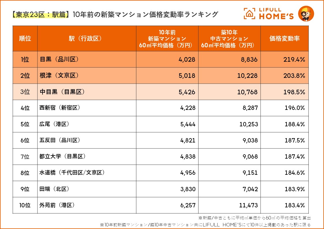 また、より詳細に駅別で価格上昇率を確認しても行政区別の傾向と同じで、都心から城南・城西にかけての駅名が上位にランキングされています。9位にランクされた「田端」は北区に所在していますが、南側で文京区に隣接していて位置としては準都心エリアです。その割に10年前の新築分譲価格が60平米換算価格で3,830万円と4,000万円に満たない金額で分譲されていた、つまりそれだけ10年前の分譲価格が“お得”だったという見方ができます。