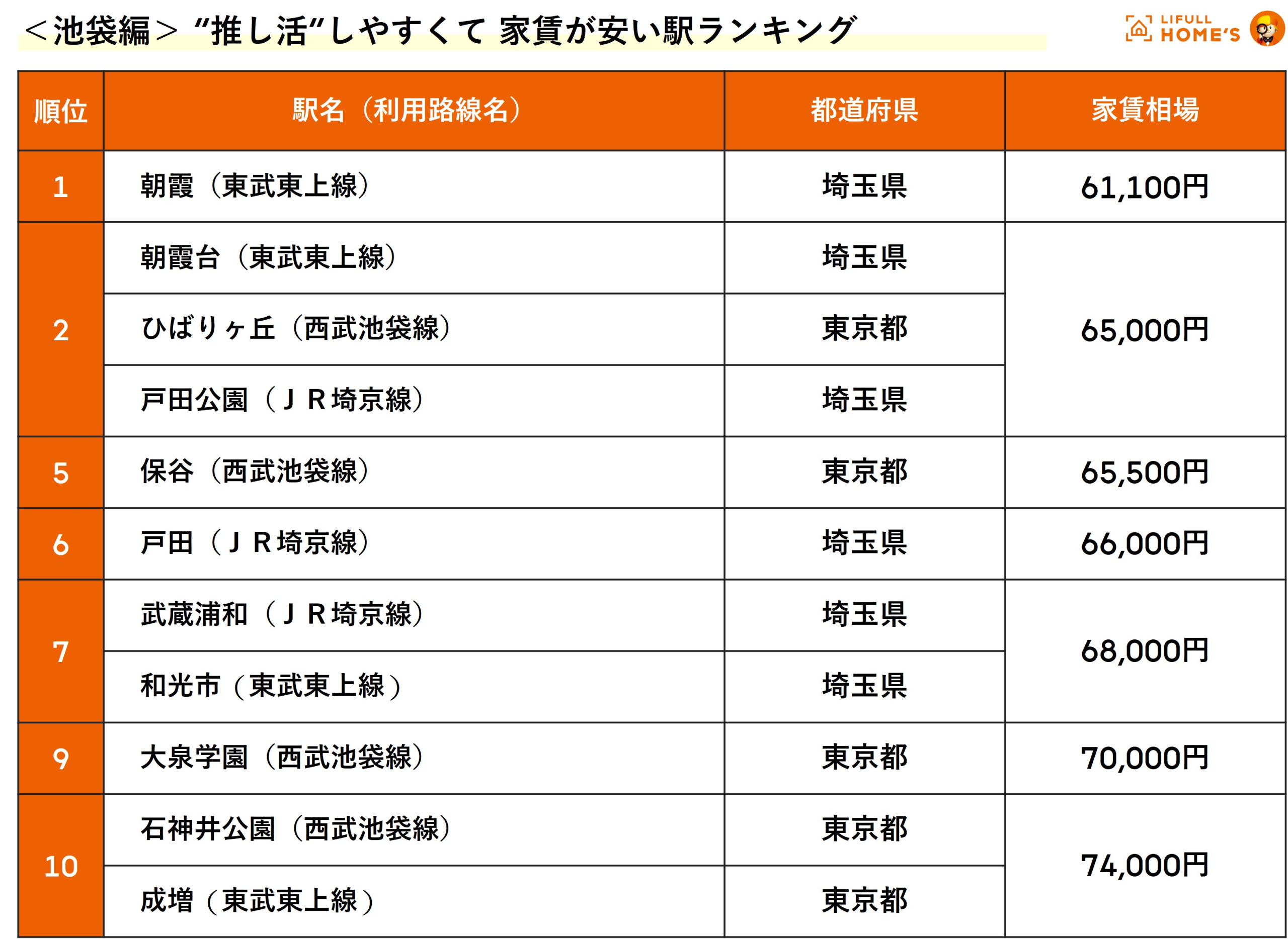 1位は「朝霞駅」(61,100円)で、東武東上線で乗り換えなしで池袋にアクセスすることができます。「朝霞駅」と同じく、東武東上線の駅からは、2位「朝霞台駅」(65,000円)、7位「和光市駅」(68,000円)、10位「成増駅」(74,000円)もランクインしています。