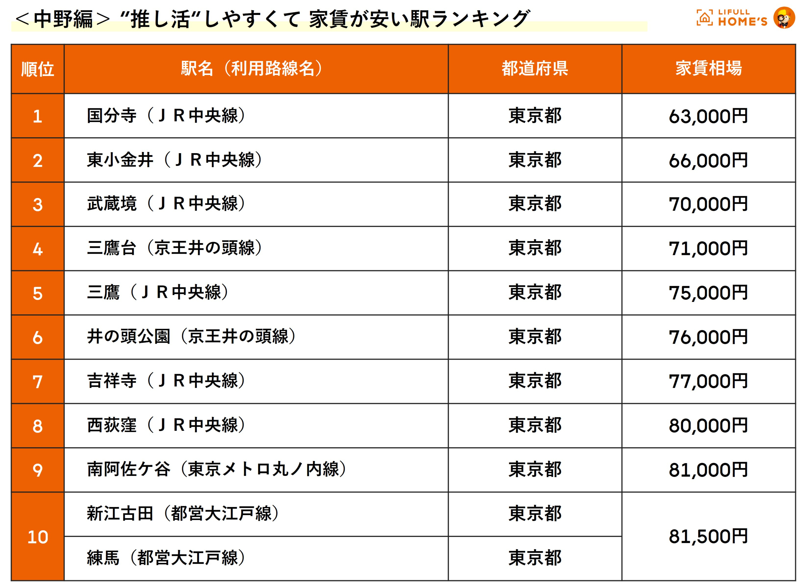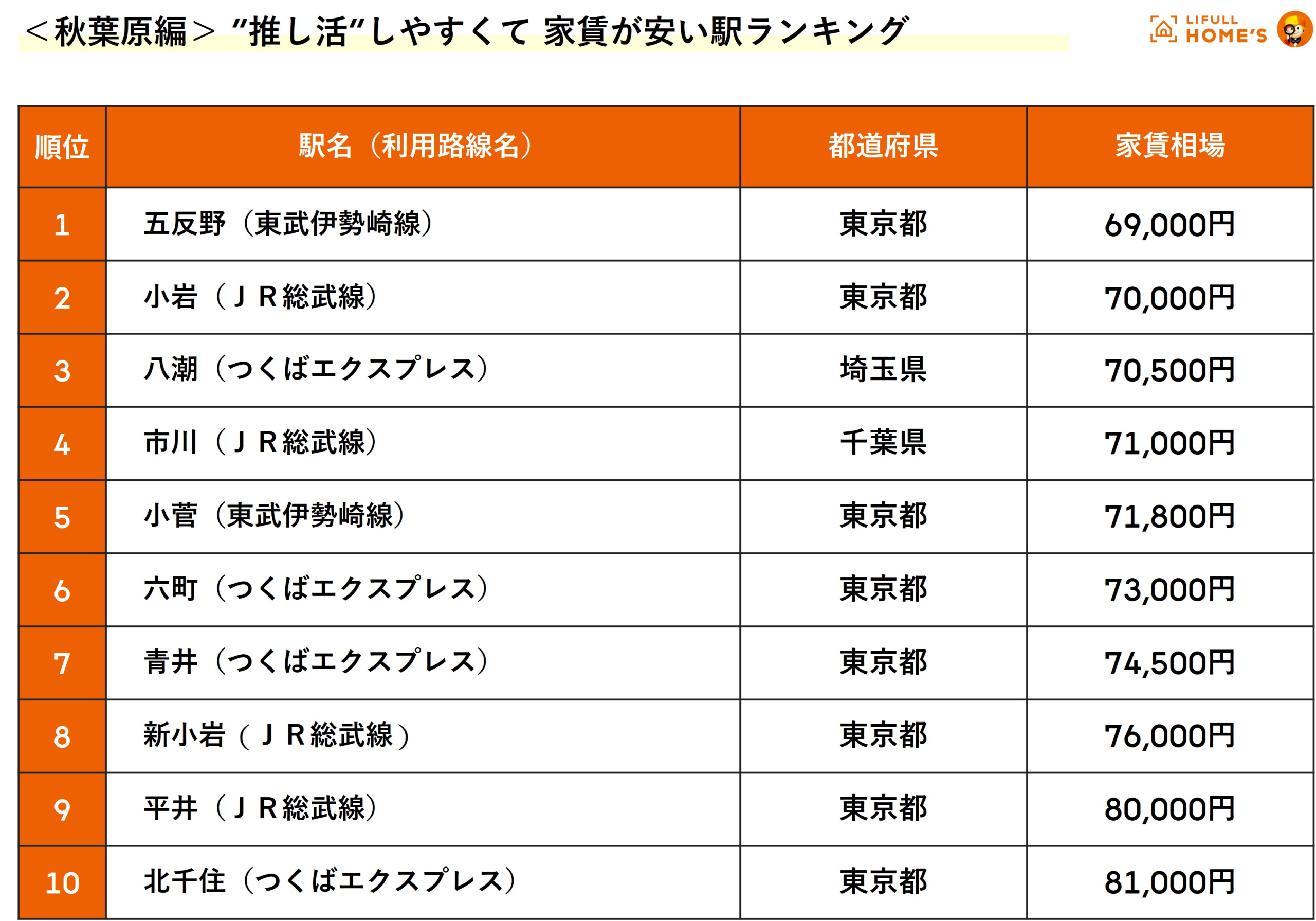 LIFULL HOME'Sが"推し活"しやすくて家賃が安い駅ランキングを発表