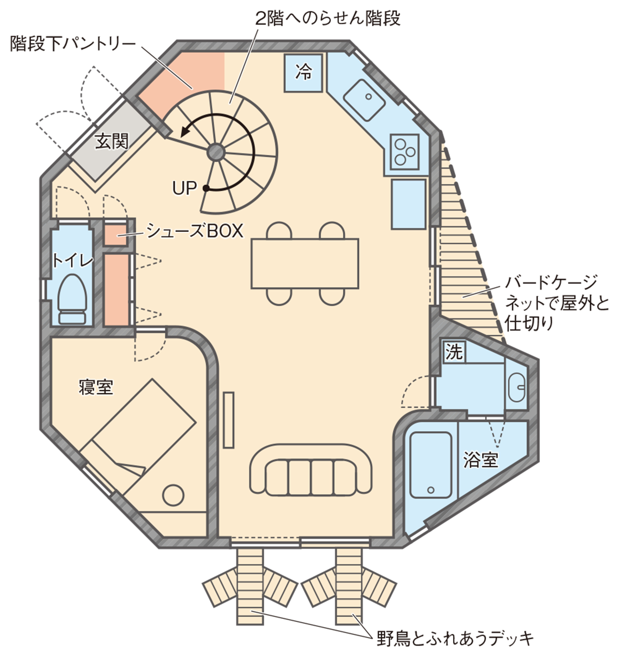 玄関がくちばしになっていたり、らせん階段が目のようになっていたりとよく見てみると家全体がヒヨコのシルエットに見える不思議な間取りです。形だけでなく、バードゲージや野鳥と触れ合うためのデッキが備わっているなど、鳥と触れ合うための設備も完備された、鳥好きの方にとってはたまらない間取りになっています。