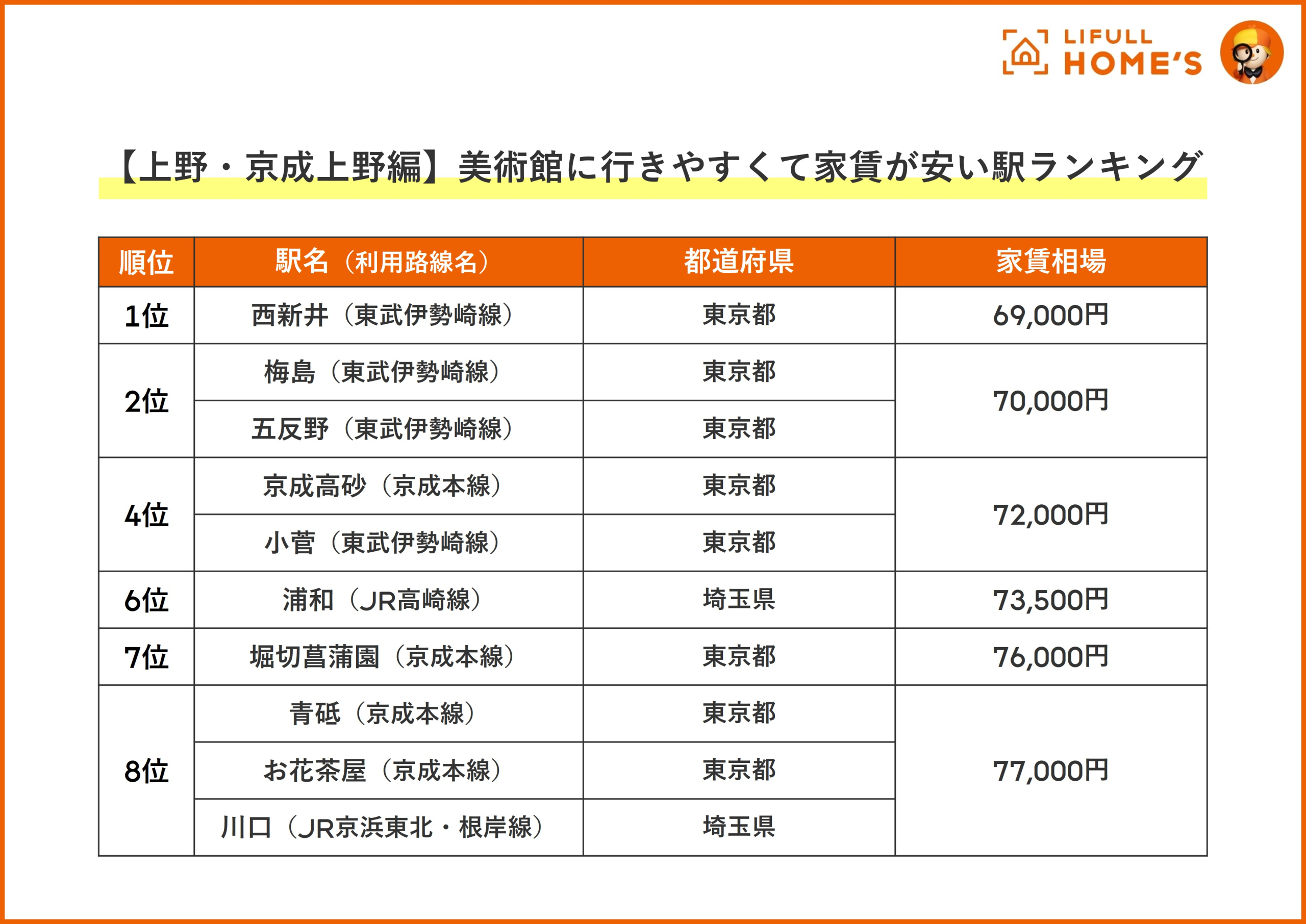 東武伊勢崎線以外では、4位「京成高砂駅」(72,000円)、7位「堀切菖蒲園駅」(76,000円)、8位「青砥駅」・「お花茶屋駅」(77,000円)など京成本線で京成上野駅にアクセスする駅も多くランクインしました。
