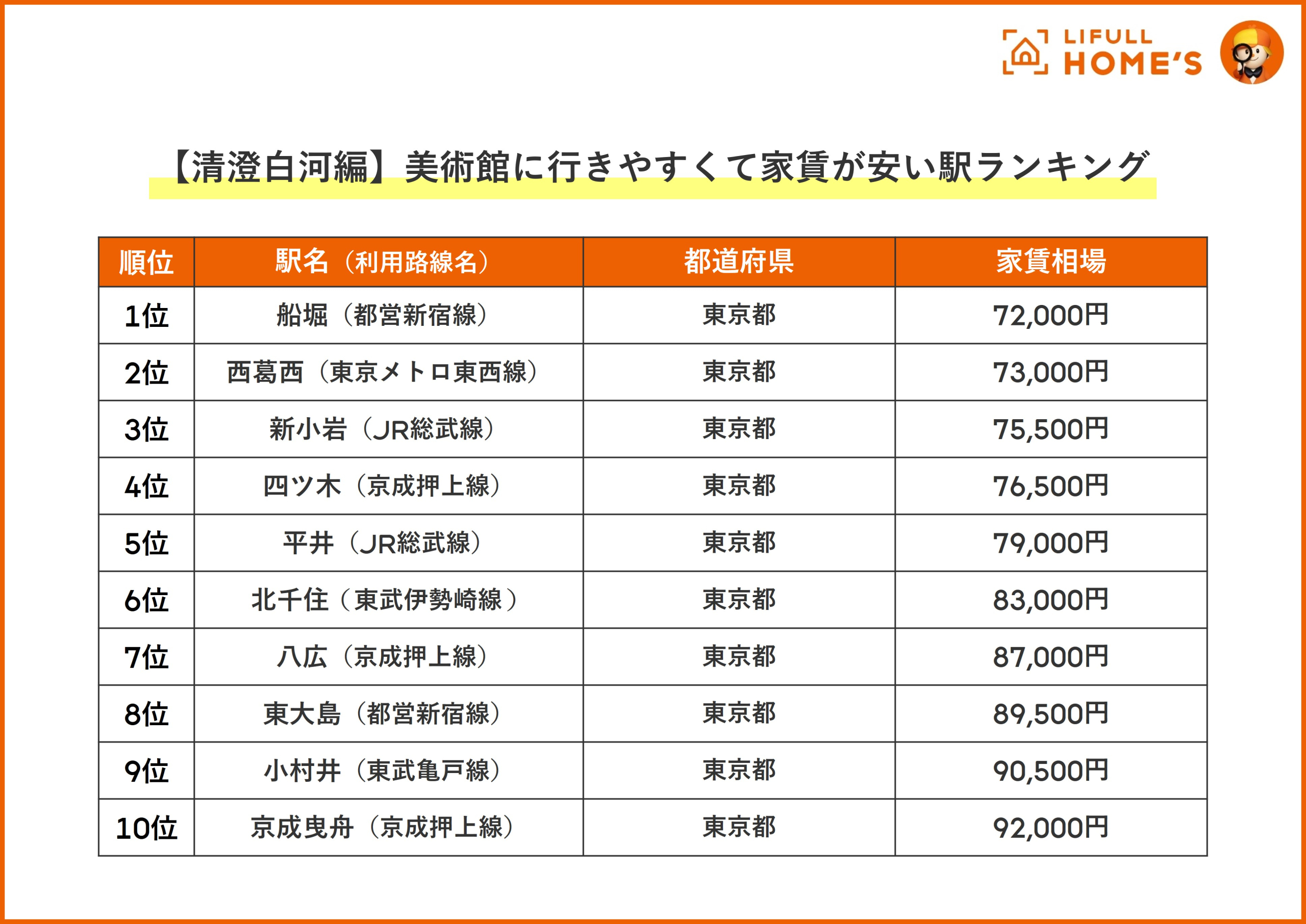 3位の「西葛西駅」(73,000円)は清澄白河編でもランクインしていたことから、複数の美術館にアクセスしやすい駅と言えます。