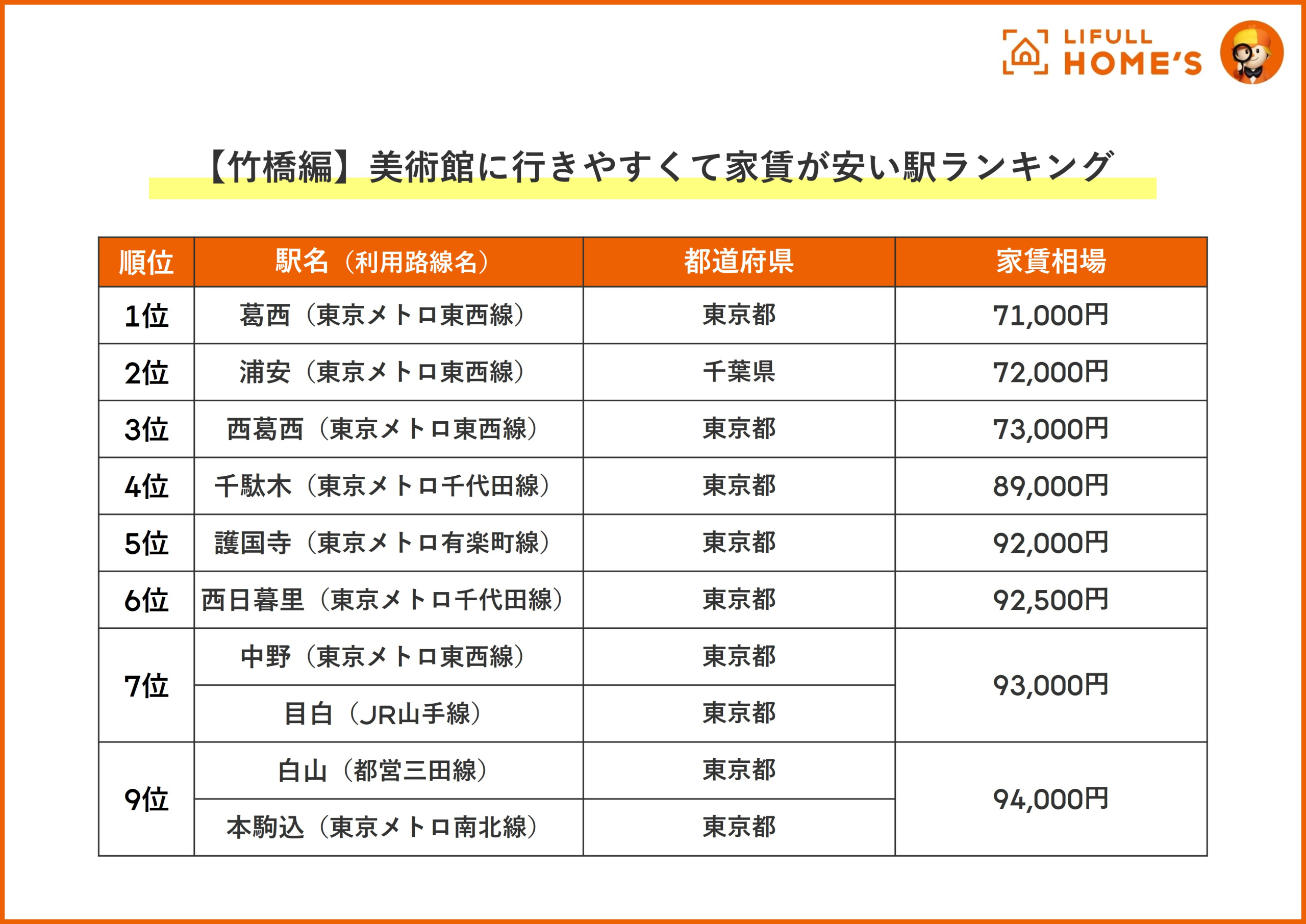 竹橋編では、葛西駅、浦安駅、西葛西駅と東京メトロ東西線沿線の駅がトップ3を占め、7位にも同沿線の「中野駅」(93,000円)がランクインする結果となりました。