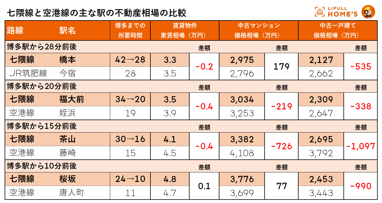 延伸開業後、七隈線と博多駅までの所要時間が同等となる空港線(および直通先のJR筑肥線)と賃貸物件の家賃相場、中古マンション、中古一戸建ての価格相場を調査しました。