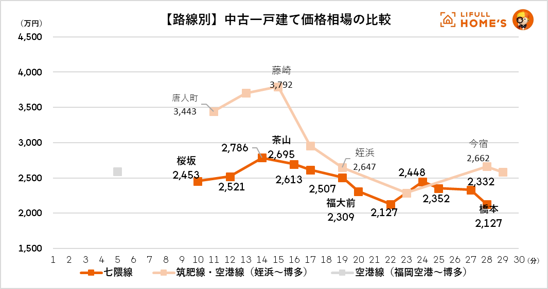 【中古一戸建て】価格相場は、博多から20分台となる駅で県平均より顕著に上昇