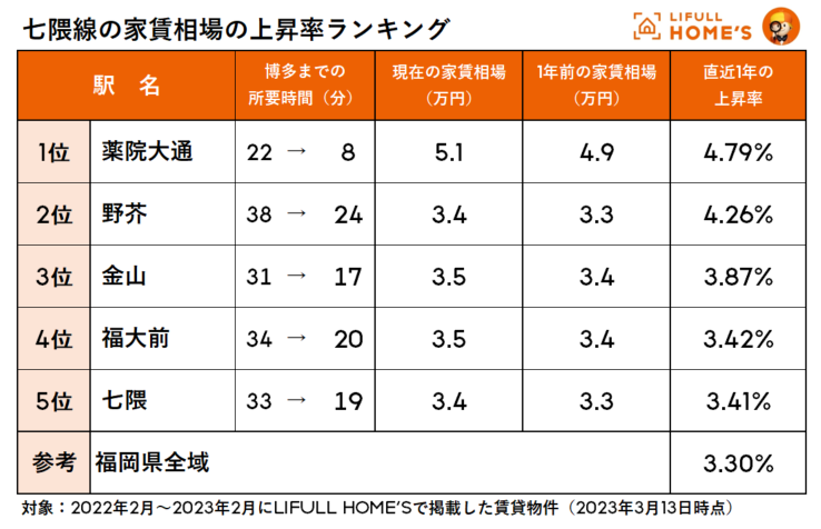七隈線沿線の直近1年の中古マンション価格相場※4の上昇率ランキングは、薬院駅が1位(7.96%)、薬院大通駅が2位(6.56%)と、これまで博多へはバス利用が主流だった薬院エリアの2駅が上位となりました。薬院駅は、「2023年LIFULL HOME'Sみんなが探した!買って住みたい街ランキング」でも前年から6ランクアップし7位にランクインしているほか、渡辺通駅(24位→13位)や別府駅(53位→17位)、も順位を上げており、延伸開業で利便性が向上する七隈線沿線への注目が集まっていると考えられます。