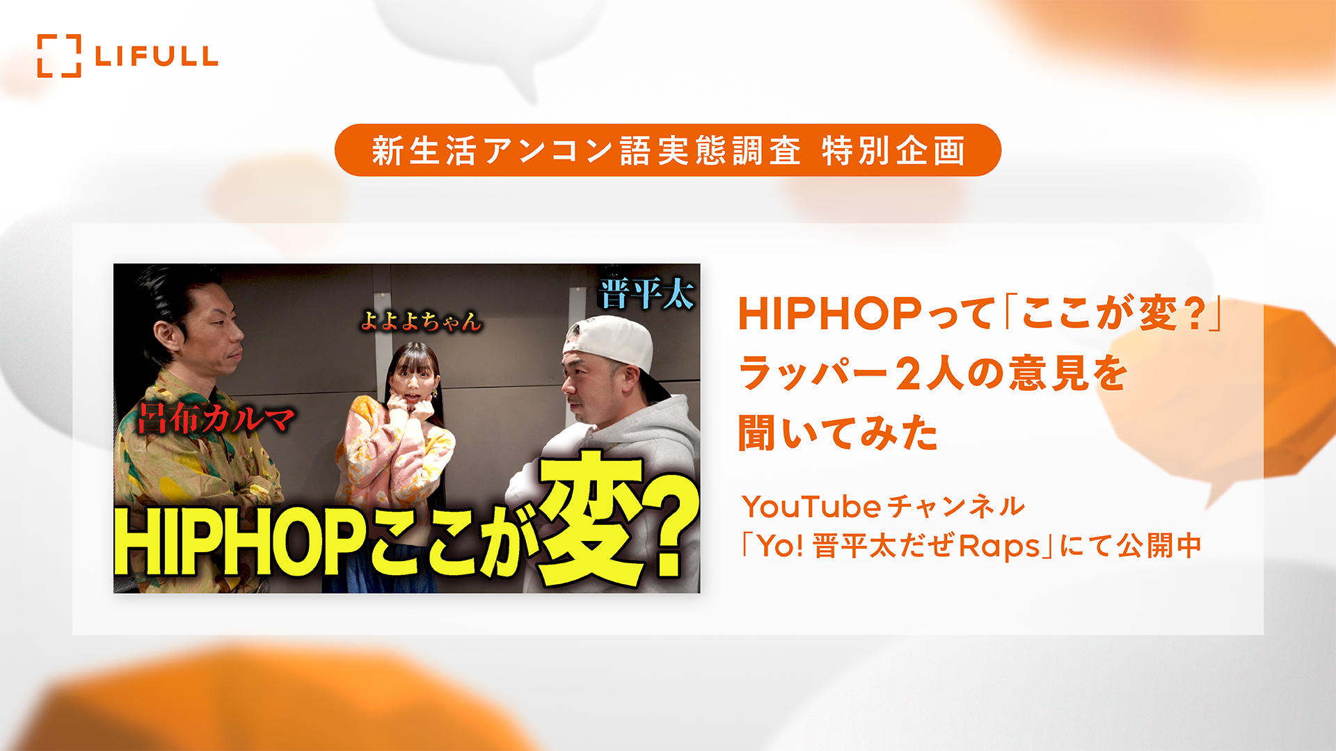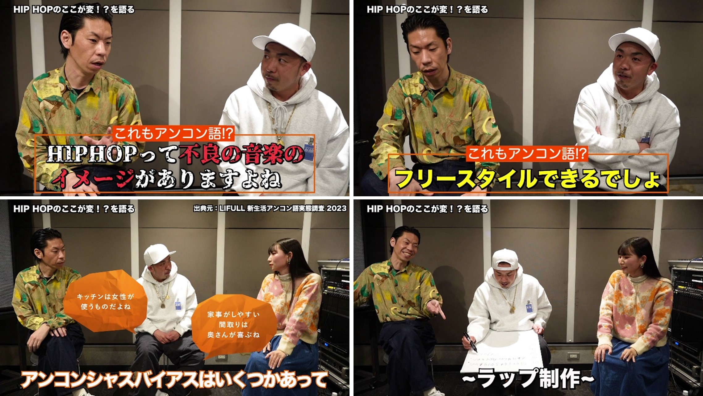 それに続き、この度、アンコンシャスバイアスがひそむ言葉「アンコン語」をテーマに、ラッパーの晋平太さんと呂布カルマさん、そしてものまねタレントのよよよちゃんによるコラボラップ動画「HIPHOPって『ここが変?』ラッパー2人の意見を聞いてみた」を2023年3月22日(水)に晋平太さんのYouTubeチャンネル「Yo!晋平太だぜ Raps」で公開開始しました。本動画では言葉のプロである3人が、HIP HOPや女性にまつわる「アンコン語」をテーマにトークし、その場でリリックを書きあげ、ラップとして披露しています。