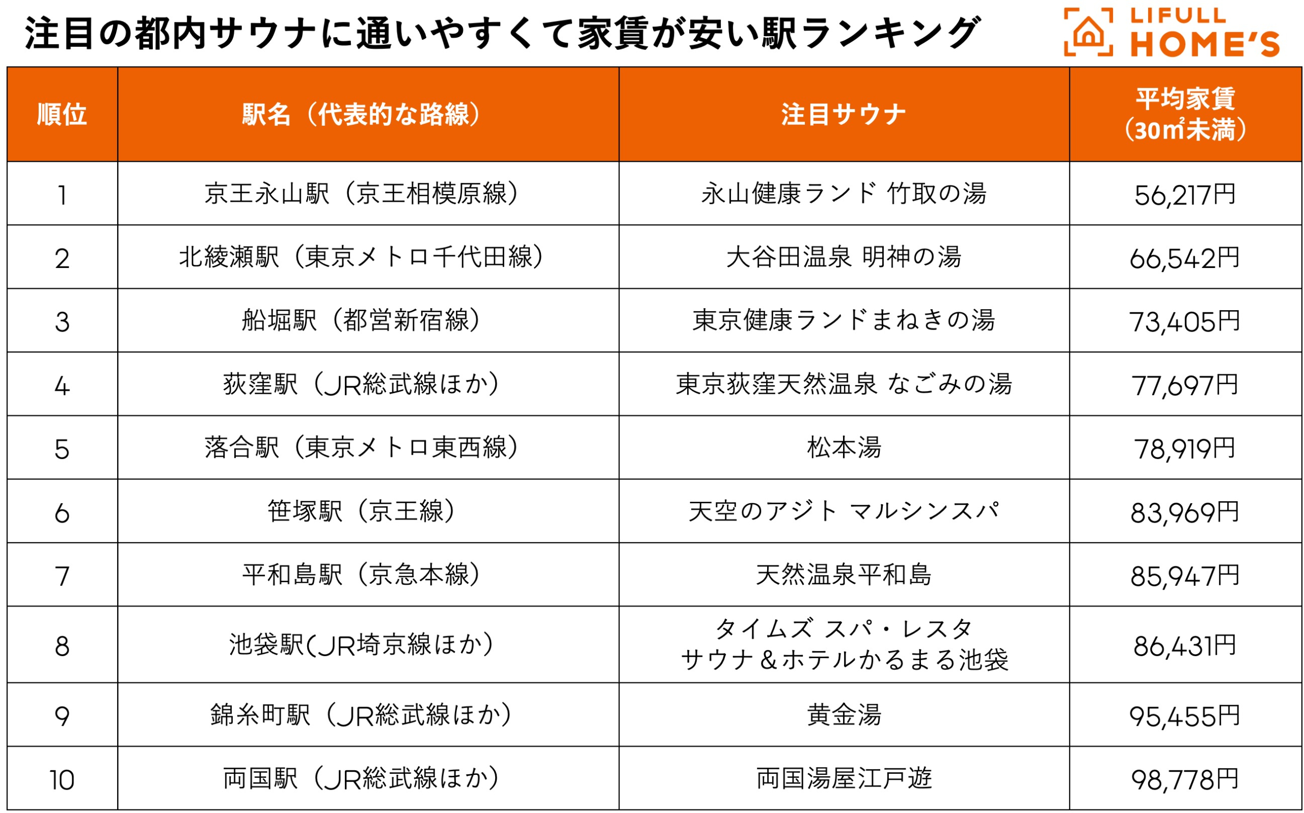 そこでLIFULL HOME'Sは、ニフティ温泉の「東京都内でサウナがオススメの温泉・銭湯・スパ15選(※2)」にランクインしているサウナがある駅の単身世帯向け物件の平均家賃を算出し、安い順にランキング化(※3)しました。