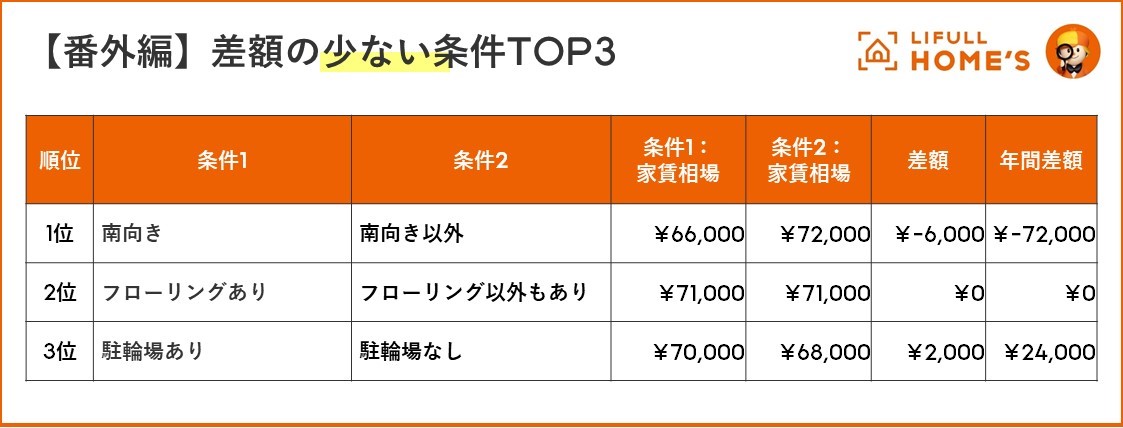 差額の少ない条件TOP3の1位は「南向き」(差額-6,000円)、2位は「フローリングあり」(差額0円)、3位は「駐輪場あり」(差額2,000円)となり、1位の「南向き」に至っては「南向き以外」の方が家賃相場が高くなるという想定外の結果となりました。