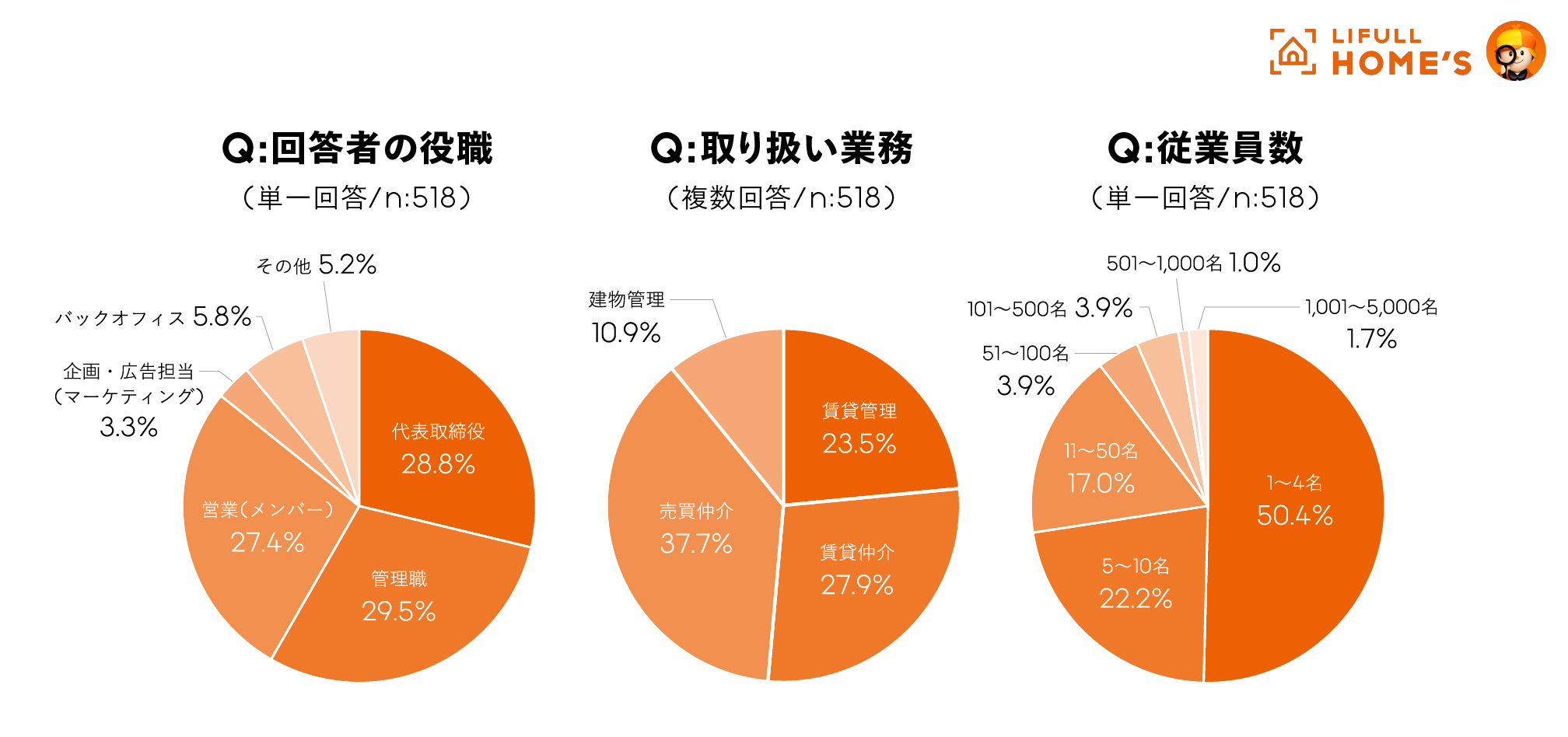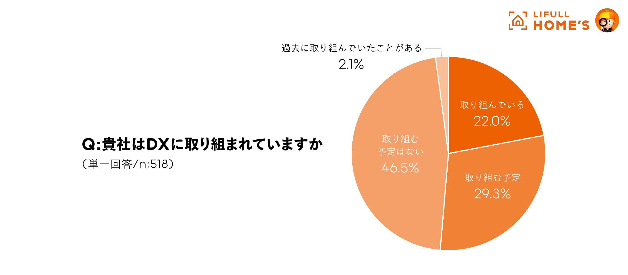 事業を通して社会課題解決に取り組む、株式会社LIFULL(ライフル)(本社:東京都千代田区、代表取締役社長:井上高志、東証プライム:2120、以下「LIFULL」)が運営する不動産・住宅情報サービス「LIFULL HOME'S(ライフルホームズ)」は、あらゆる業界でDX(デジタルトランスフォーメーション)への対応が求められる中、「不動産業界のDX化*促進」を目的として、不動産会社向けサービスなどを提供する6社と共同で、全国の不動産会社に勤める518人を対象とした「不動産会社のDX推進に対する実態調査」を実施しました。