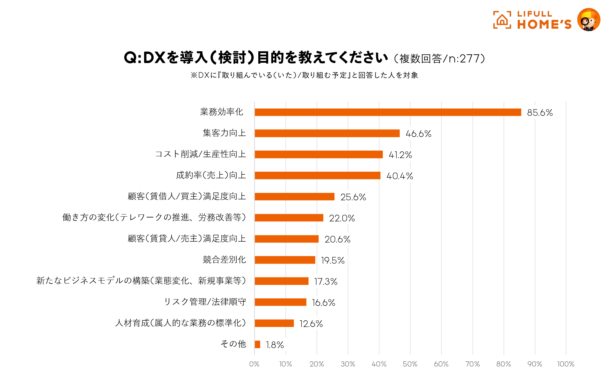 DXに「取り組んでいる」「過去に取り組んでいたことがある」または、「取り組む予定」と回答した人を対象とした「DX導入(検討)目的を教えてください」の質問では、最も多いのが「業務効率化」で85.6%、次いで「集客力向上」が46.6%、「コスト削減/生産性向上」が41.2.%、「成約率(売上)向上」が40.4%となりました。