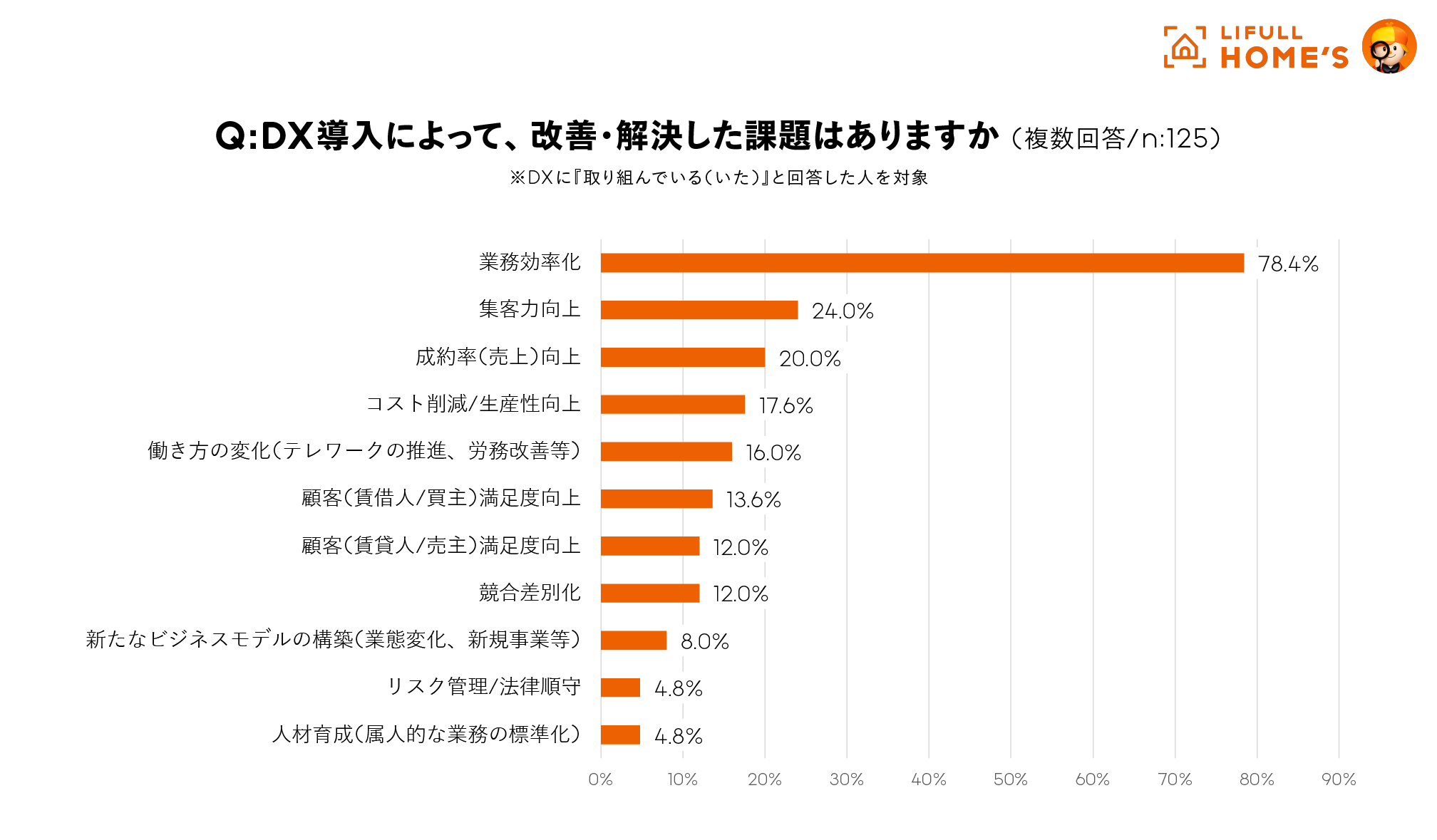 さらに、「DX導入によって、改善・解決した課題はありますか」の質問では、最も多かった回答が「業務効率化」で78.4%となっており、DX導入の目的と成果はどちらも「業務効率化」が最多という結果になりました。