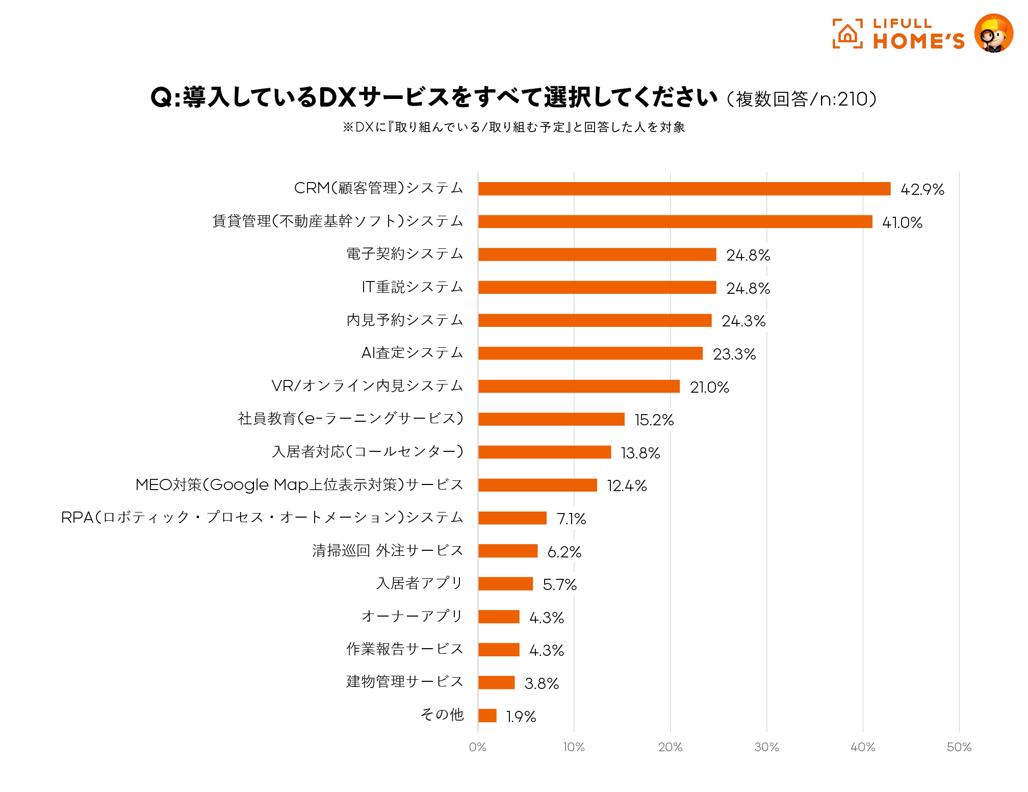 DXに「取り組んでいる」または、DXに「取り組む予定」と回答した人のうち、「導入しているDXサービスを選択してください」の質問では、多い順に、1位の「CRM(顧客管理)システム」が42.9.%、2位が「賃貸管理(不動産基幹ソフト)システム」で41.0%、3位が同率で「電子契約システム」「IT重説システム」24.8.%となりました。