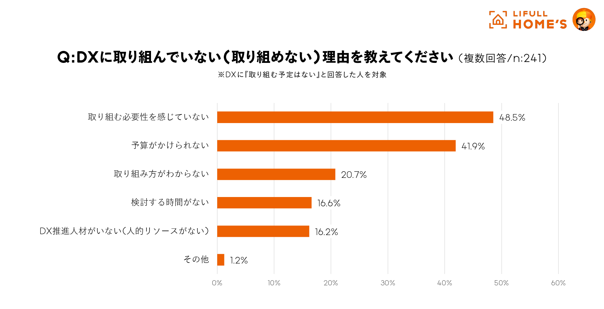 約半数がDXへ動き出していないことからもよみとれるように、不動産業界におけるDX導入の成功事例が伝わっておらず、取り組むメリットや対応への切迫感が理解されていないため、「取り組む必要性を感じていない」という回答が多くなっている可能性も考えられます。