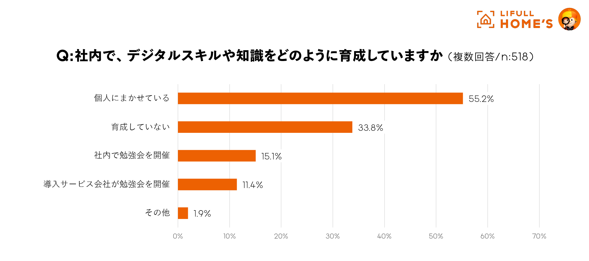 「社内で、デジタルスキルや知識をどのように育成していますか」の質問では、「個人にまかせている」55.2%が最も多く、次いで多かったのは「育成していない」で33.8%でした。