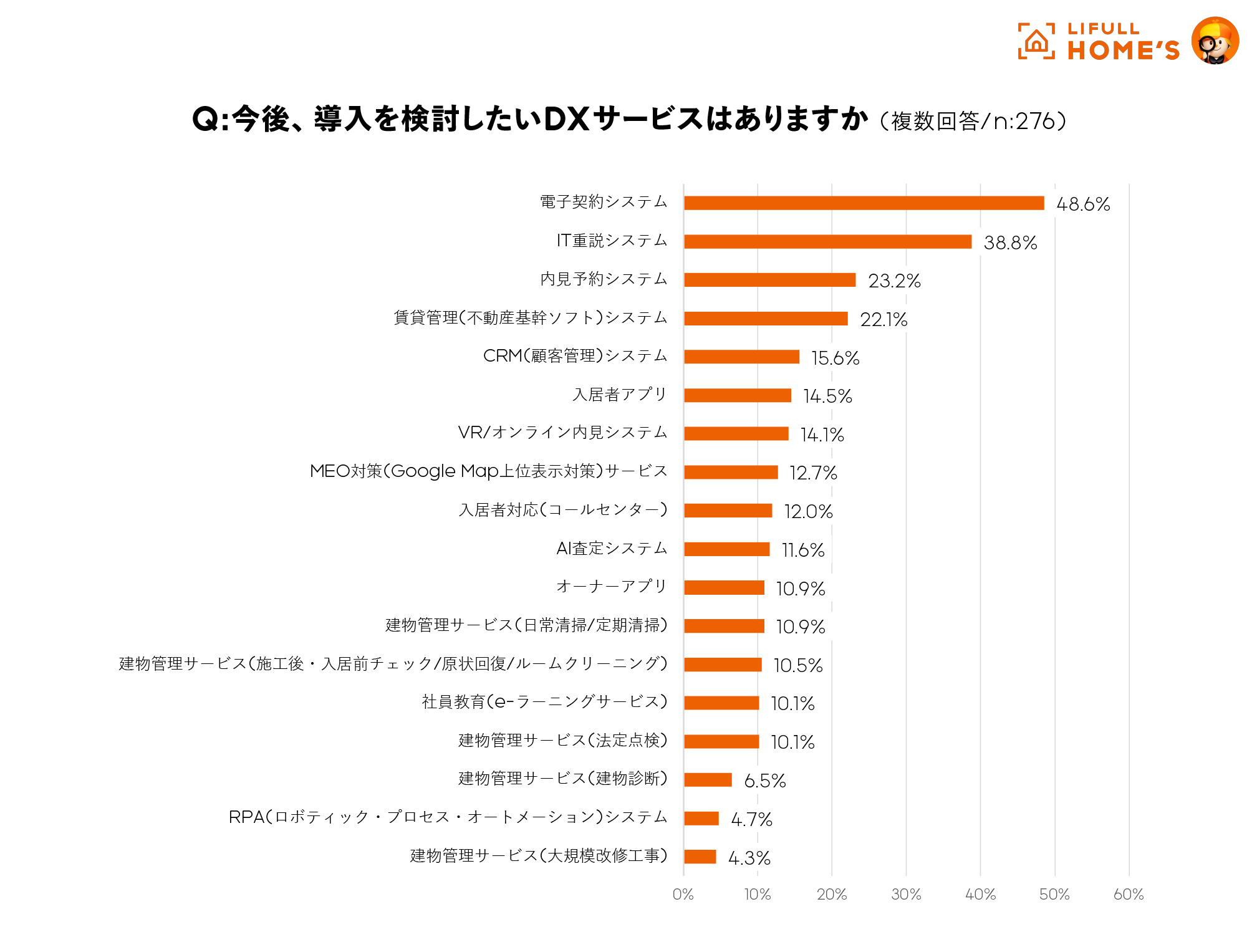 今後新たにDXサービス導入を検討している方を対象とした、「今後、導入を検討したいDXサービスはありますか」の質問では「電子契約システム」が48.6%、次いで「IT重説システム」38.8%となりました。
