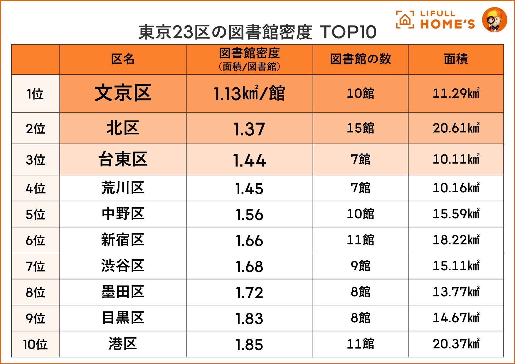 区ごとに面積が異なるため、区の面積を区内の図書館数で割った「図書館密度」を算出しました。その結果、図書館密度が最も高い区は、面積が23区中4番目で10館ある文京区(1.13㎢/館)でした。2位は15館ある北区(1.37㎢/館)、3位は台東区(1.44㎢/館)、4位は荒川区(1.45㎢/館)、5位中野区(1.56㎢/館)と城北エリアから3区が入りました。