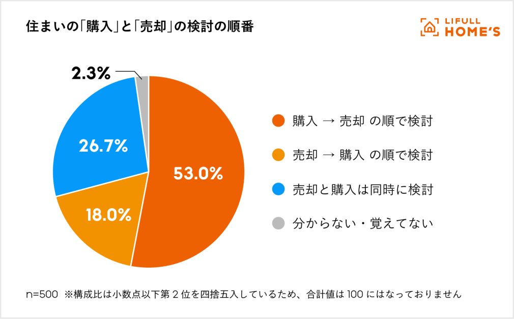 まず住み替えの検討の順番について尋ねたところ、多くの人が「新たに住まいを購入したいという気持ちや理由が先にあり、その後、前の家を売却しようと決めた」と回答しており、「前の家を売る理由や必要性が先にあり、その結果、新たに住まいを購入しようと決めた」とする人を大きく上回りました。