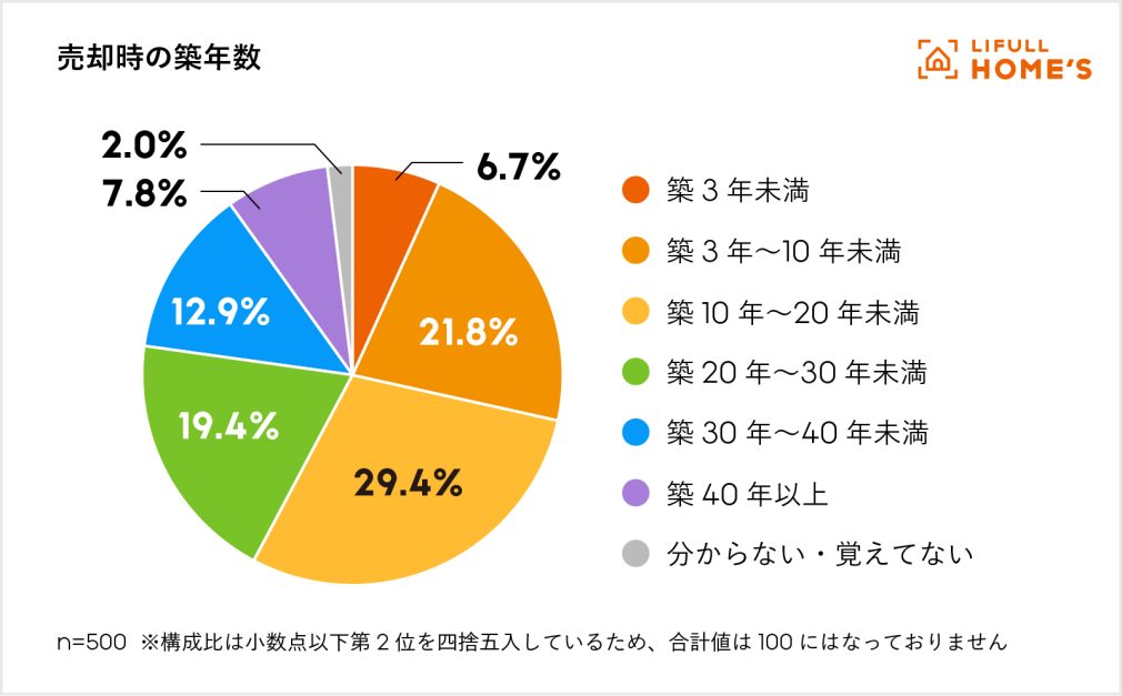 売却した物件の売却時の築年数を聞いたところ、「築10年以上20年未満」が29.4%と最も多く、ついで「築3年以上10年未満」が21.8%となっています。