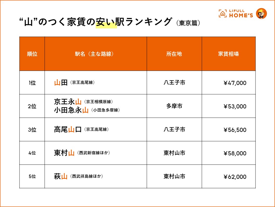 ■ “山”のつく家賃の【安い】駅ランキング:1位は「山田」。5位の「東村山」は本当は「東群山」だった?