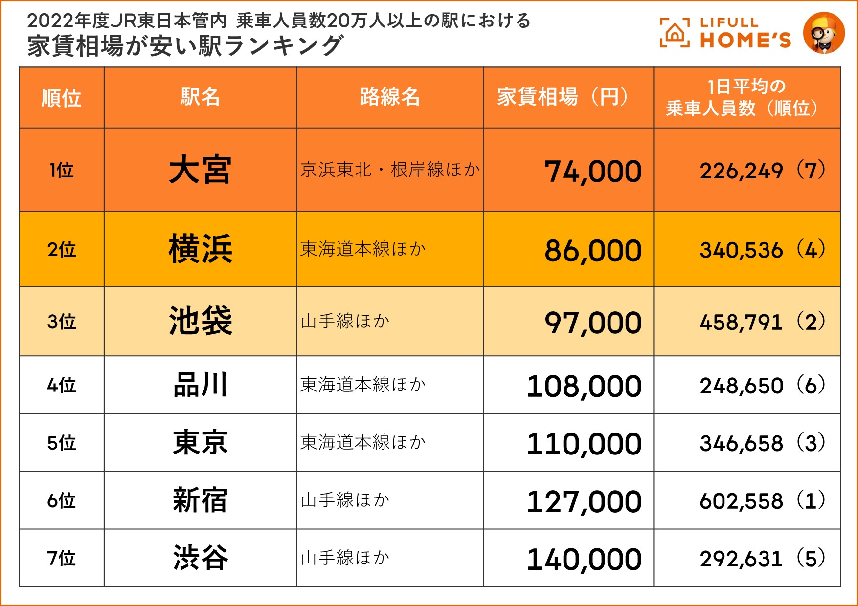 JR東日本管内の乗車人員20万人以上の駅における家賃相場が安い駅ランキングをLIFULL HOME'Sが発表、1位「大宮駅」