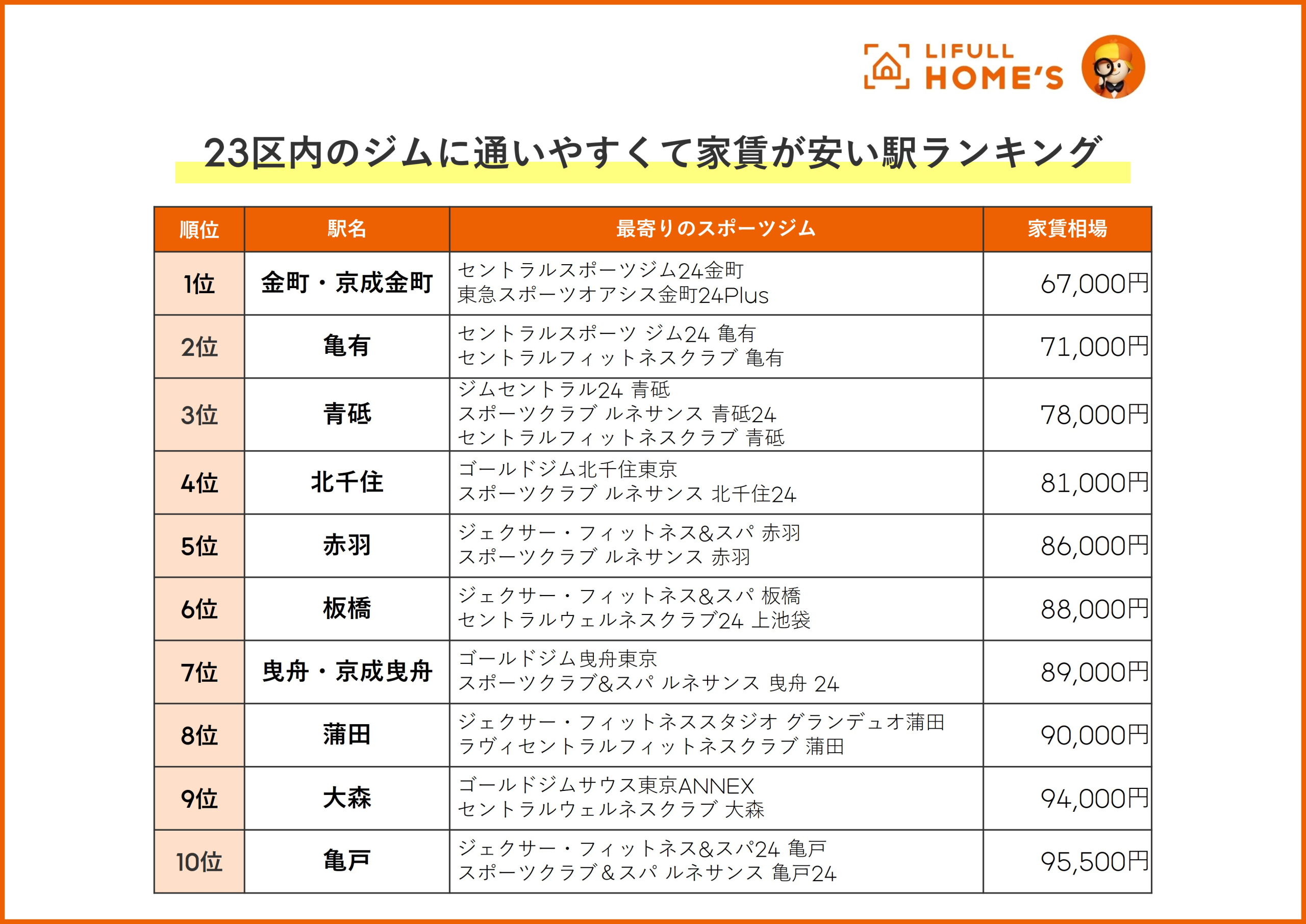 ■1位は「金町駅」・「京成金町駅」で6万円代!城東エリアはジム通いしやすい?