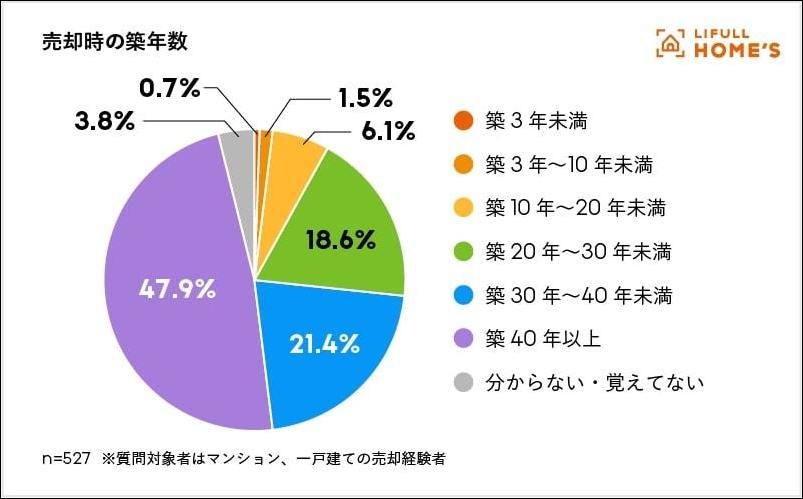 実際に売却した不動産の築年数について聞いてみると、「築40年以上」が47.9%と圧倒的に多く、約半数を占めました。「築20年~30年未満」(18.6%)、「築30年~40年未満」(21.4%)と合わせると、相続不動産の9割近くが築20年を超える物件ということになります。