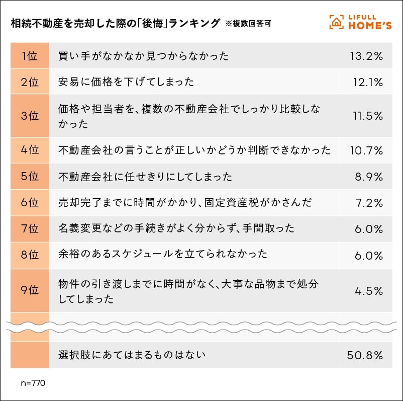 相続した不動産を売却した際に後悔した点について聞いてみたところ、「買い手がなかなか見つからなかった」(13.2%)や「安易に価格を下げてしまった」(12.1%)「価格や担当者を、複数の不動産会社でしっかり比較しなかった」(11.5%)などの項目が上位となりました。一方で回答として最も多かったのは「選択肢にあてはまるものはない」(50.8%)で、この状況から、一般的な選択肢で括ることができない、家庭ごとの個別の事情があるということも考えられます。