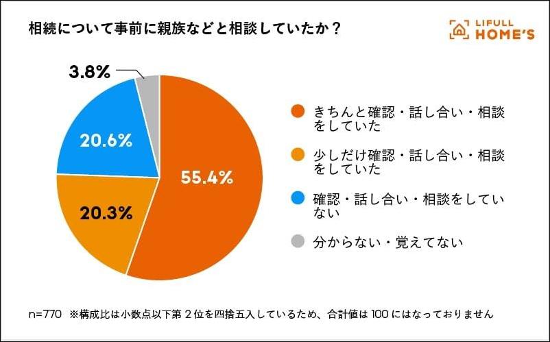 相続について、「事前に親族と確認・話し合い・相談をしていたか」という質問については、「きちんと確認・話し合い・相談をしていた」が55.4%、「少しだけ確認・話し合い・相談をしていた」が20.3%となり、程度に差はあれど約8割が事前に話し合いをしていました。一方で「確認・話し合い・相談をしていない」という人も2割程度存在することが明らかになりました。