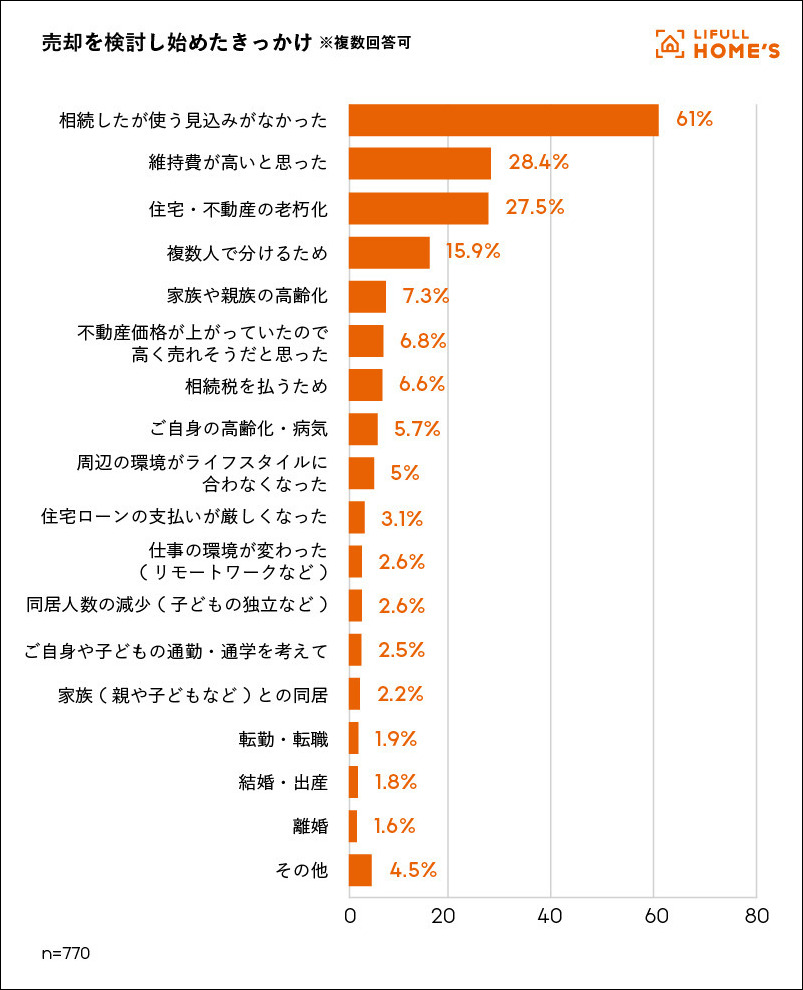 こうした状況を踏まえ、今回は、過去5年以内に自分か配偶者が日本国内の不動産を相続し、相続から3年以内に売却を考えはじめ、売却に至った25~84歳の男女770人に、売却理由や後悔している点、また相続以前に話し合っていた内容などについて聞きました。